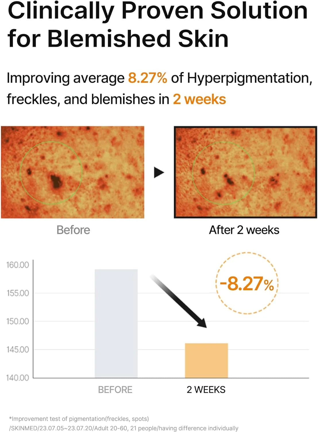 Éclaircissement ciblé : La combinaison de niacinamide, d’acide tranexamique et de la technologie brevetée Melazero V2 (extrait de feuille de nispéra, extrait de menthe verte et propanediol) aide à estomper les taches sombres et à uniformiser le teint.